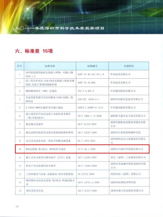 在2012年11月5日召开的全市科技创新大会上,深圳市委副书记王穗明同志宣布了深圳市科学技术奖励通报,《MPR出版物》行业标准(CY/T58.1-2009)荣获2011年度深圳市科学技术奖标准奖。